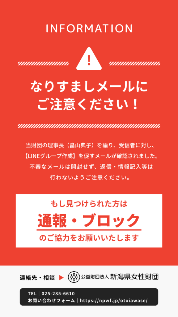 先日、当財団の理事長(畠山典子)の名前を騙り、受信者に対して LINEグループ(ワークグループ)の作成を求める迷惑メールが確認されました。